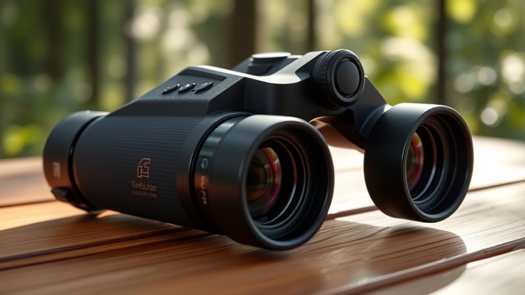 When you take your binoculars outdoors, they need to handle more than just good lighting and clear skies. Durability is essential, especially if you’re on rugged adventures where shocks and impacts are common. Look for models with rubber armor or reinforced enclosures—they improve grip and absorb shocks, protecting your device.