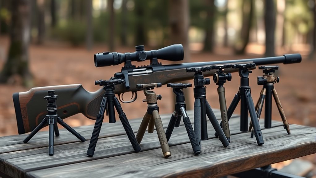 Make certain the bipod attaches firmly to your rifle’s sling stud or Picatinny rail for consistent stability while moving. Choose lightweight materials like aluminum or carbon fiber—they offer durability without adding bulk, helping you maintain balance on diverse surfaces.