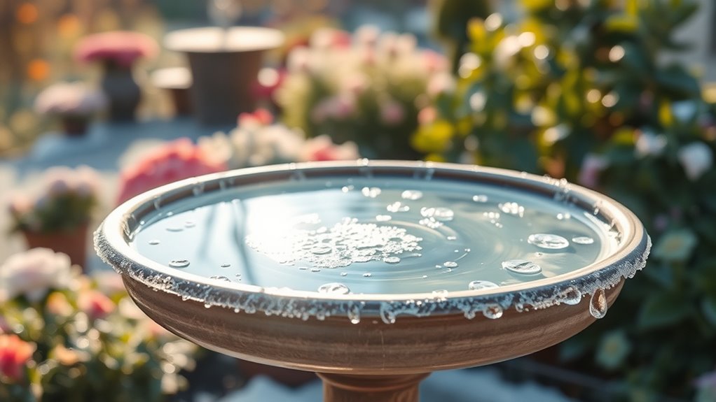 Thermostat control range is the key to reliable ice prevention without wasting energy. The range determines when your de-icer activates and deactivates to keep water unfrozen without overheating. A wider range lets the device respond to variable winter conditions, maintaining stable temperatures in your bird bath.