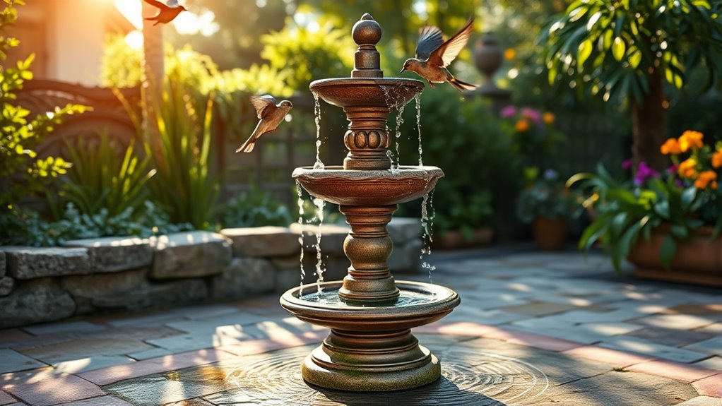 Juxtapose quiet reflections with lively visits; let water’s circle mirror your days: bright, brief, and beautifully balanced. Embracing a bird bath fountain for outdoors brings a unique harmony to your garden, blending nature’s charm with soothing sounds. This thoughtful addition not only enhances your space but also invites a peaceful retreat for both you and your feathered friends.