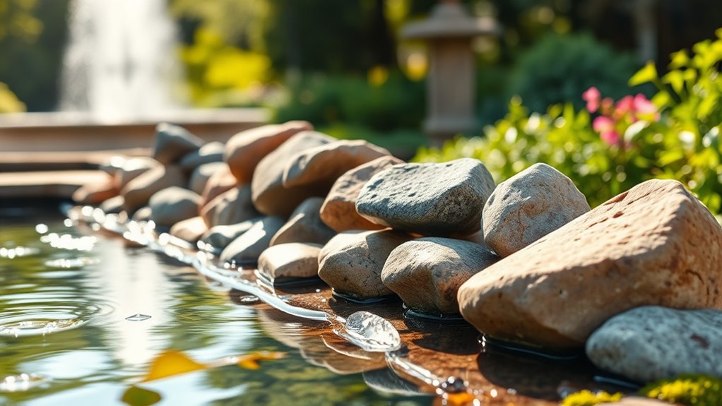 For bird baths, these rocks brighten your space while protecting feet and paws—just pick sizes that suit your setup and avoid sharp edges. Consider color harmony with water and surrounding greenery, and opt for low-maintenance options to keep algae at bay.