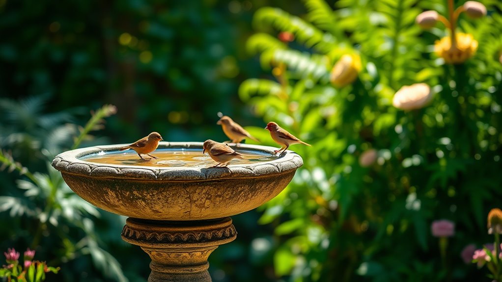 Materials that can withstand rain, snow, and sun without breaking down should be your top priority when picking a bird bath. You want weather-resistant items that won’t degrade after exposure to the elements. Durable options like high-quality metal, resin, or heavy-duty plastic are less likely to crack, warp, or rust over time.