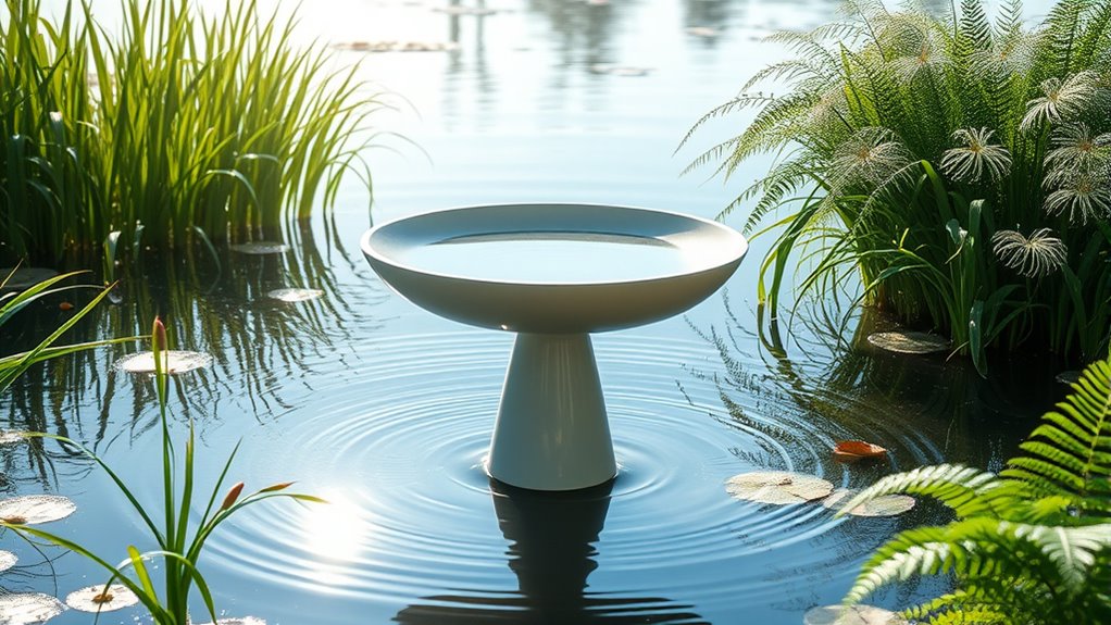 Choosing the right materials and purity levels for a bird bath is essential to keep the water clean and safe. You’ll want materials like copper, stainless steel, and certain plastics, since they influence water purification effectiveness. Aim for copper at ideally 99.99% purity to maximize natural antimicrobial properties for cleansing.