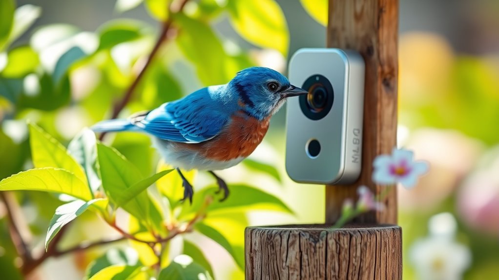 A user-friendly app or interface is essential for quickly retrieving videos and photos without hassle. Also, consider cameras offering cloud storage with enough space and simple sharing options for accessing footage across devices. Finally, guarantee the camera allows remote access and sends real-time notifications, letting you view live footage and stored data anytime, anywhere, keeping you connected to your feathered visitors effortlessly.