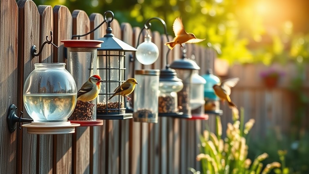In summer, heat won’t degrade metal, yet choose rust-resistant materials. For spring, guarantee sealable edges to prevent seed spillage. Regular cleaning prevents mold, and you’ll keep seed dry by staggering placement away from heavy winds.