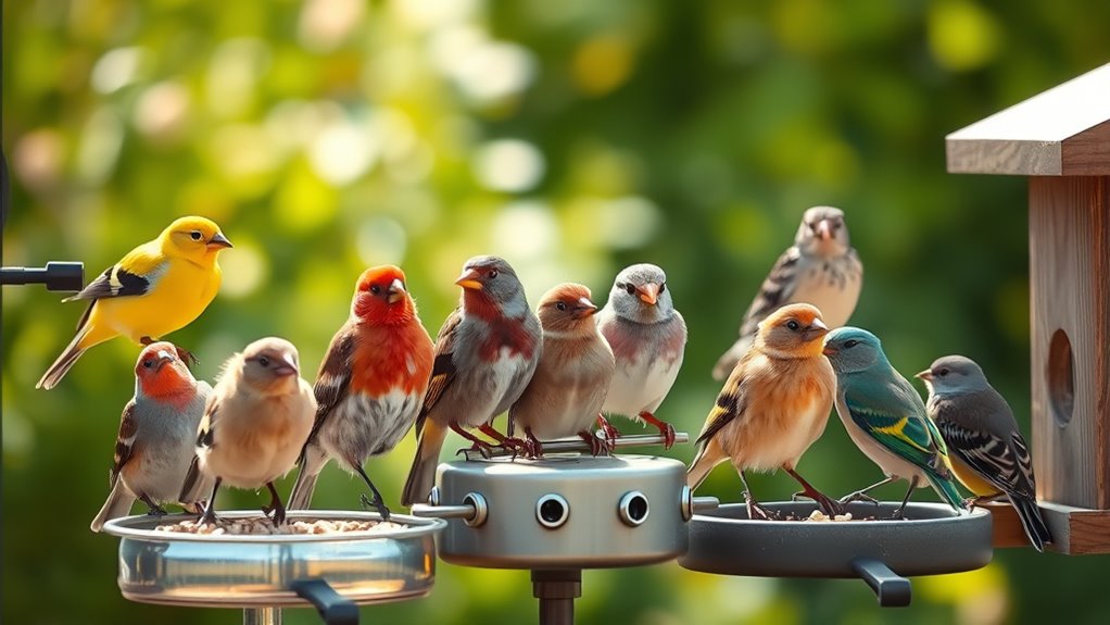 Weather adaptability is essential when picking a finch feeder, so choose designs that stand up to rain, snow, and temperature swings. You’ll want weather-resistant materials like metal or treated wood that resist moisture and warping. Look for rainproof domes or covered trays that shield seeds from precipitation, keeping freshness intact.