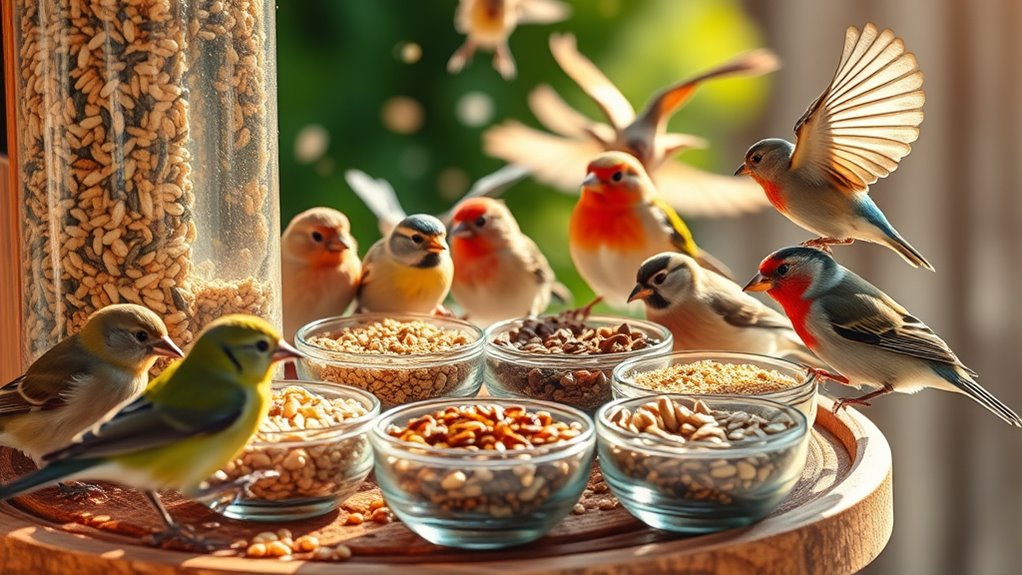 Birds pick foods that mirror their natural diets, so understanding ingredient attractiveness helps you choose what to offer. You’ll notice birds are drawn to options resembling their wild fare, like sunflower seeds, peanuts, and dried fruits, which supply essential nutrients and energy.
