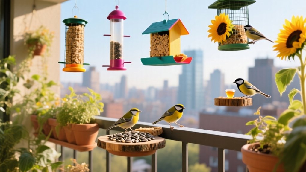 You’ll want bird feeders that are durable, weather-resistant, and easy to install on your apartment balcony railing.