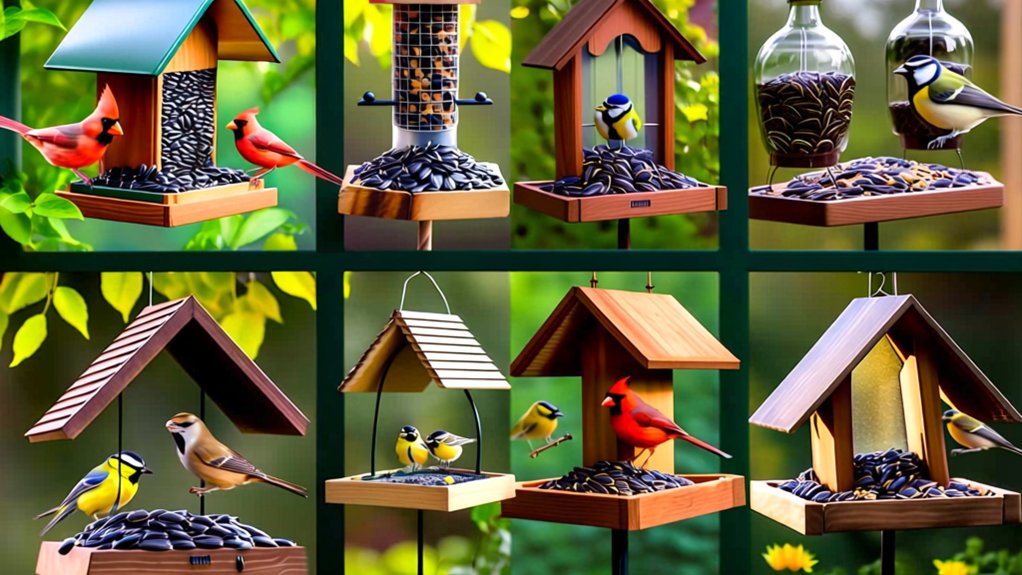 Because squirrels can quickly deplete your black oil sunflower seeds, choosing a feeder with effective squirrel-proof features is essential. Look for feeders that use weight-sensitive mechanisms to close access when squirrels land, allowing only birds to feed. Adjustable shrouds or spring-loaded systems are great options, blocking squirrels without harming birds.