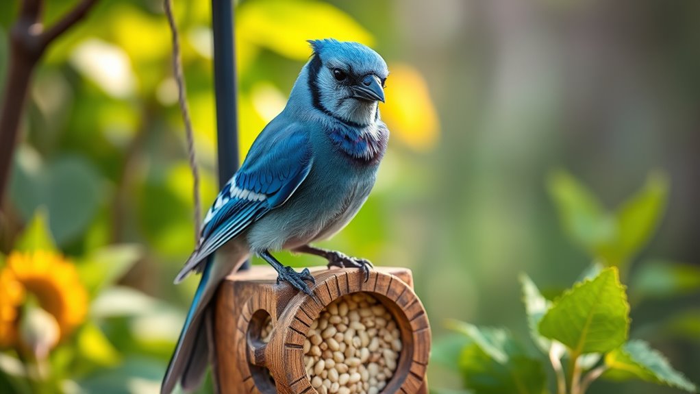 Selecting a feeder made from durable materials sets the stage for attracting blue jays, but matching the feeder to the right seed types guarantees they’ll keep coming back. Blue Jays prefer large, high-fat seeds like peanuts, sunflower seeds, and suet, which provide essential energy. Choose feeders that accommodate whole peanuts and large sunflower seeds to suit their feeding habits.