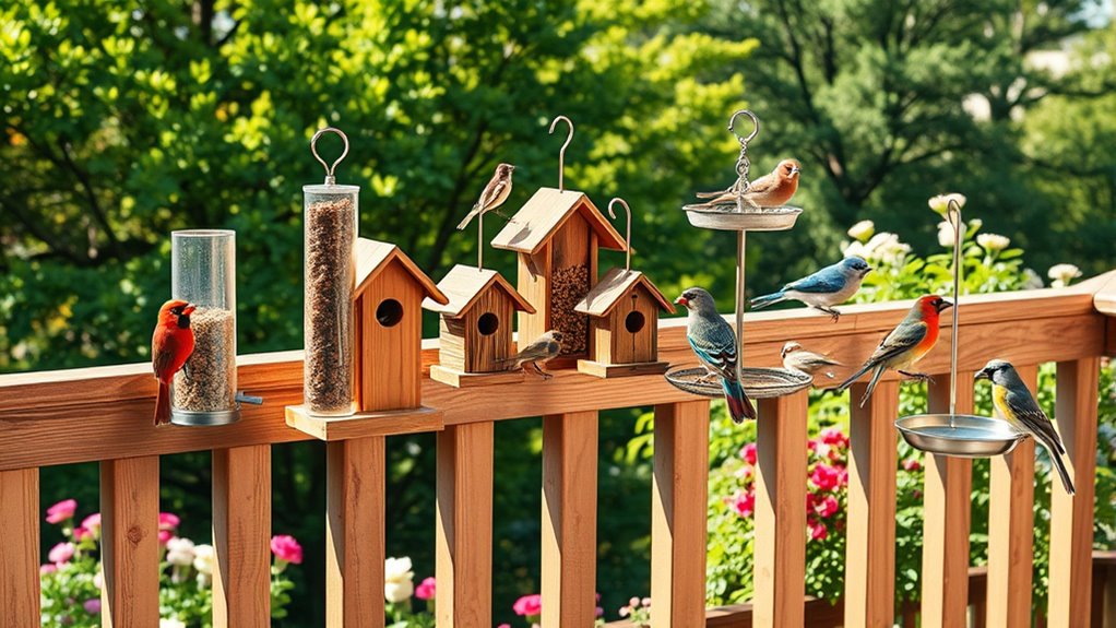 Although durability is essential, you’ll also want to take into account the bird feeder’s weight capacity to guarantee it safely supports seeds, water, and visiting birds. Start by checking the manufacturer’s specified maximum load limit to avoid damage or detachment from your deck railing.