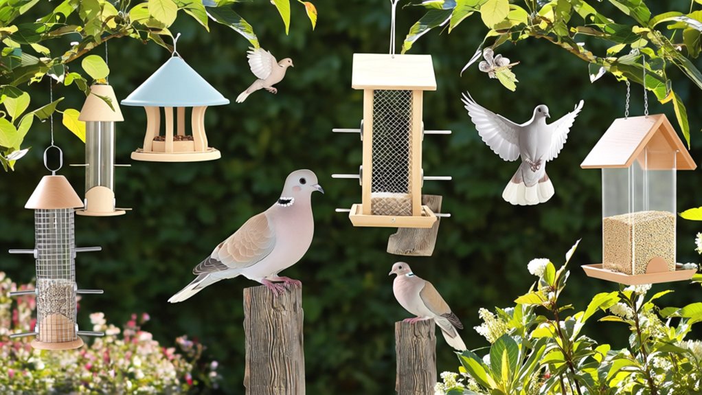 Moreover, opt for feeders with drainage features, such as perforated bottoms, to prevent water buildup, keep seeds fresh, and extend the feeder’s lifespan. Prioritizing these qualities guarantees your dove feeder stands up to the elements year-round.