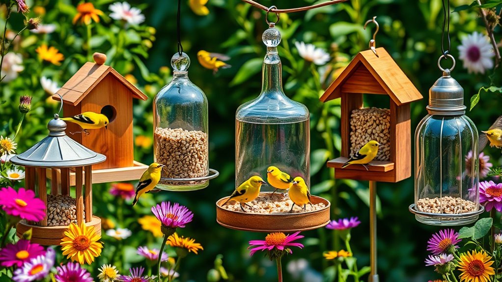 You’ll want a durable bird feeder with small ports and mesh designed for Nyjer or thistle seeds to attract goldfinches easily. Look for weatherproof, rust-resistant metal feeders with multiple perches and clear seed compartments, so you can keep an eye on food levels.