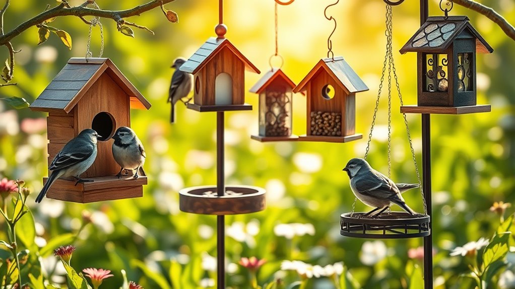 Although selecting the right seeds is essential, choosing a feeder made from durable materials is just as important to guarantee long-lasting use and protection against weather damage. You’ll want feeders made from weather-resistant materials like high-quality metal with rust-resistant finishes, treated wood, or UV-resistant plastic.