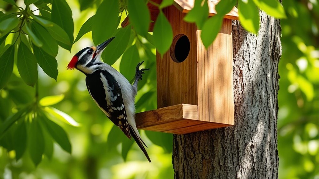 Guarantee the feeder’s perches and feeding ports accommodate their beaks and claws, supporting their natural climbing and tapping behaviors. Since some woodpeckers can be territorial, you might need multiple feeders or thoughtful placement to minimize conflicts and encourage regular visits.