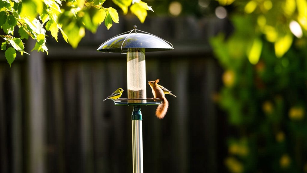 Although selecting a bird feeder pole with a squirrel baffle might seem straightforward, ensuring it is compatible with your specific feeder is essential for optimal use. First, check the pole’s diameter to make sure it fits your feeder securely. Adjustable poles let you set the height to attract different bird species effectively.