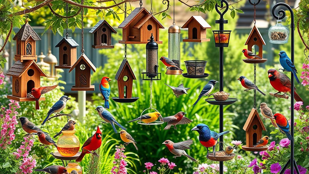 You’ll want bird feeders that are durable, weatherproof, and squirrel-resistant to attract beautiful birds all year. Look for heavy-duty metal construction with protective roofs, easy refilling lids, and multiple feeding ports for flock feeding.