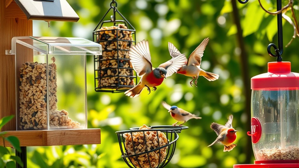 You’ve got options that cover everything from simple trays to durable, chew-proof designs, plus seeds and blends tailored for different birds. With the right feeder and food, you’ll turn your yard into a lively, fluttering gallery.