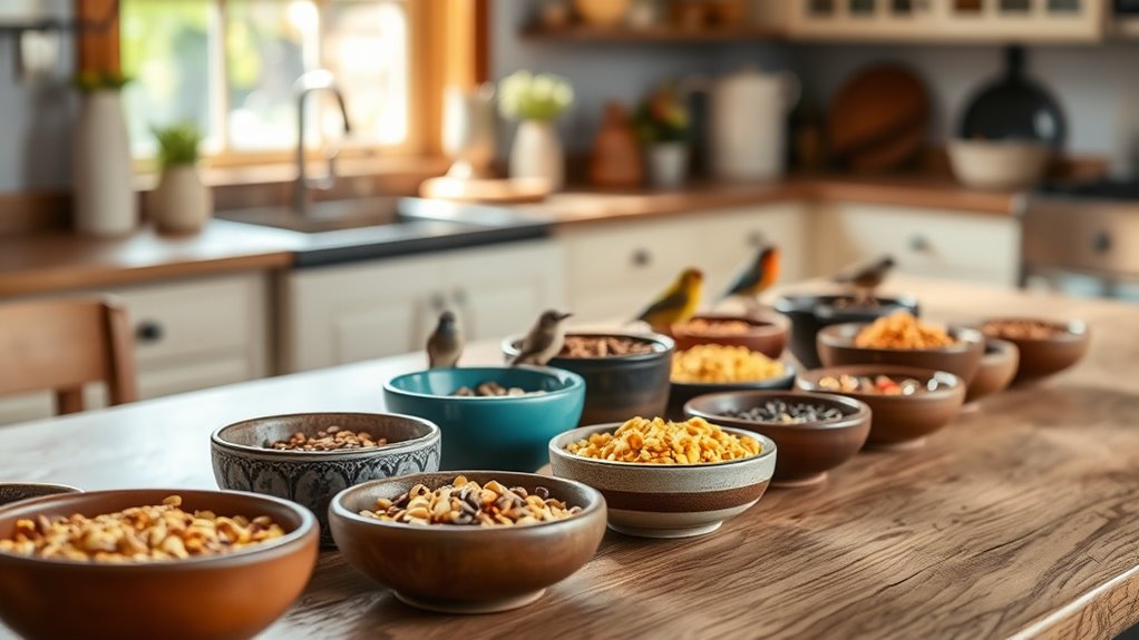 You’ll want bowls that stay put, are easy to clean, and suit your bird’s size. Among these picks, stainless steel with clamps reduce spills and resist rust—perfect for active eaters. Fun fact: birds can drop up to 30% of their food during meals, so secure bowls cut waste and mess.