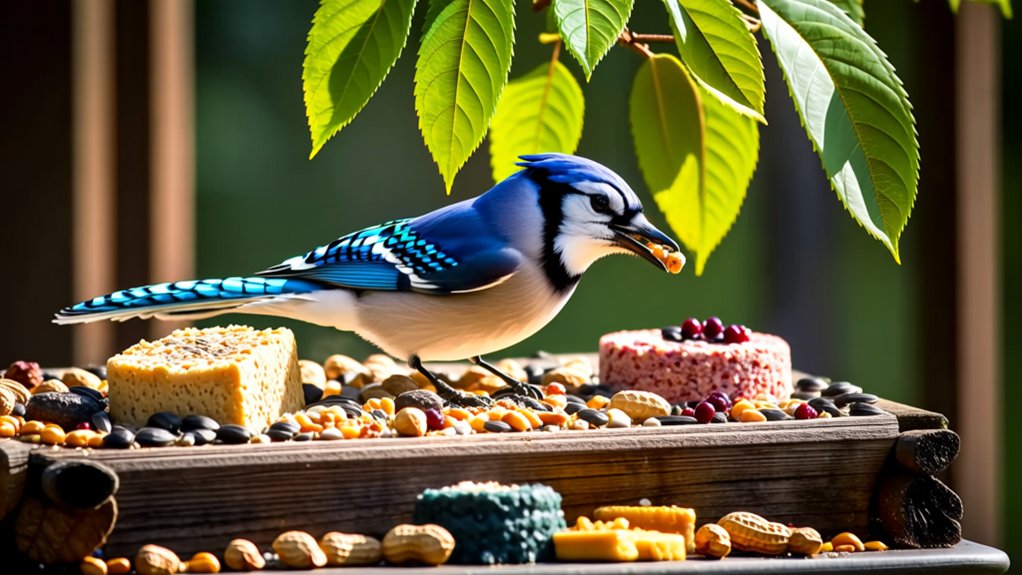 Don’t forget calcium, especially during breeding season, since it’s crucial for egg production and overall health. By providing a diverse, nutrient-rich diet, you’ll not only attract Blue Jays but also support their longevity and reproductive success in your backyard.