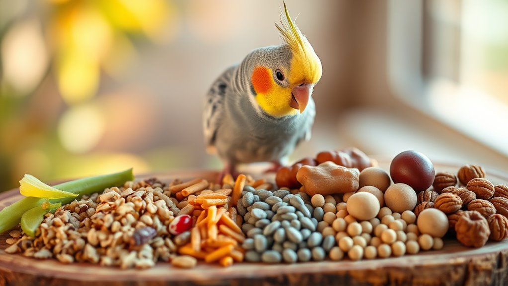 A balanced cockatiel diet combines seeds, grains, and vegetables to mirror what they’d eat in the wild, with proteins, fats, vitamins, and minerals in the right proportions to support health. You should aim for variety in seeds, grains, and vegetables to reflect natural intake while avoiding excess fillers and artificial additives. Confirm essential nutrients—proteins, fats, vitamins, and minerals—appear in appropriate amounts to support growth, energy, and overall wellness.
