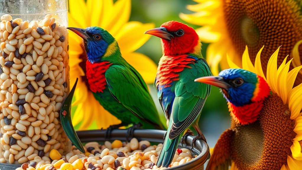 When you pick bird food for colorful species, start with Seed Composition Variety to match their preferences and avoid bland offerings. Consider Target Bird Species and Nutritional Balance to make sure the mix supports vibrant plumage and overall health.