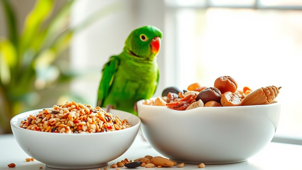 To shift smoothly, you gradually swap in fortified commercial foods while limiting seeds. Start by mixing a small amount of the new fortified formula with your conure’s familiar mix, then slowly increase the new portion over 2–3 weeks. Watch for changes in appetite, droppings, and energy.