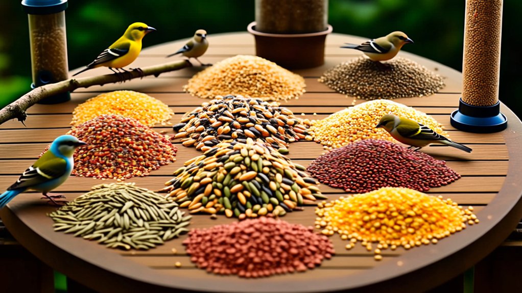 Including millet, canary seed, and safflower adds diversity, attracting different finch species and enhancing your birdwatching experience. By offering a well-rounded seed mix, you guarantee your finches get a balanced diet that meets their specific needs. Remember, finches prefer variety, so don’t stick to just one type. Mixing seeds stimulates their natural feeding habits and keeps them returning for more.