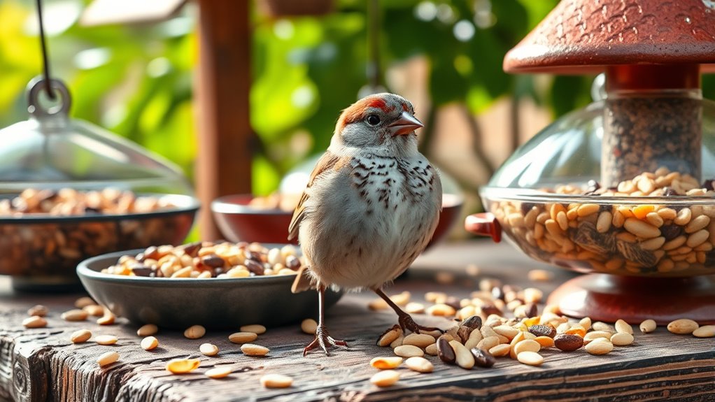 Remember that weather also alters natural food availability, making supplemental feeding important during scarce periods. By adjusting seed types and feeding frequency to seasonal bird behaviors, you can support health and longevity. Tailor your choices to how sparrows respond across the year for consistent, effective nourishment.