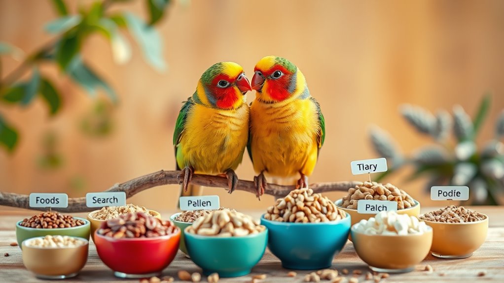 When you choose food for your lovebirds, prioritize high-quality protein and balance it with a sensible pellet-to-seed mix to support growth and energy. Consider freshness and proper storage to keep nutrients intact, and look for a vitamin and mineral profile that supports bone, feather, and immune health.