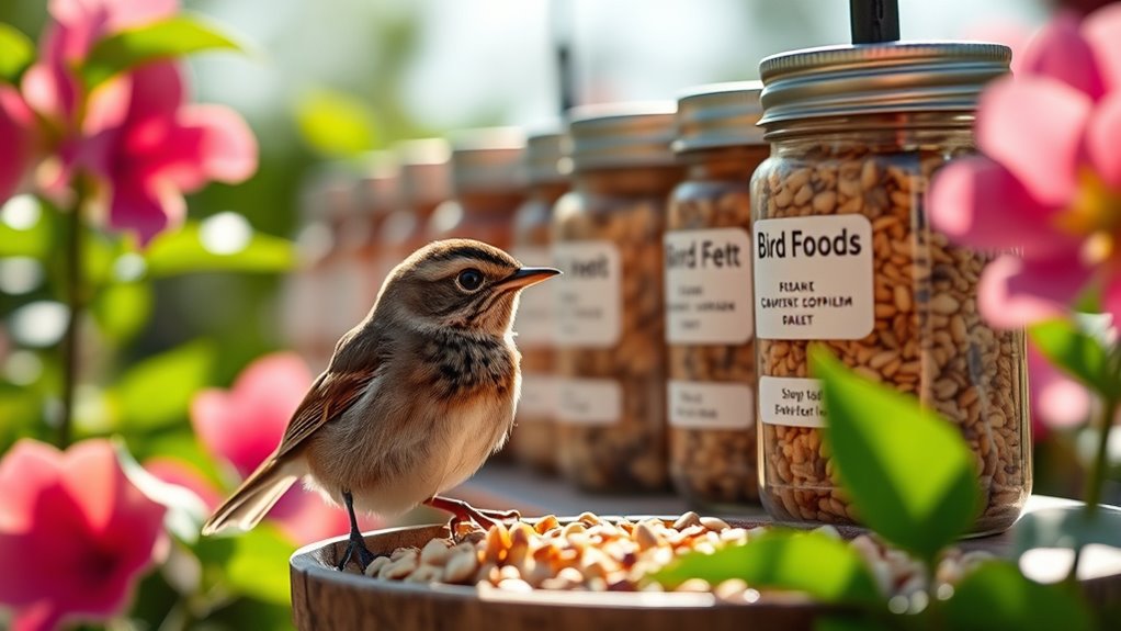 Protein content is a key factor when choosing bird foods for wrens, since these tiny, active insectivores rely on high-protein diets to fuel daily foraging, muscle development, and feather growth. You’ll notice wrens thrive on foods rich in protein, like mealworms and nuts, which attract longer feeding visits and encourage sustained activity.