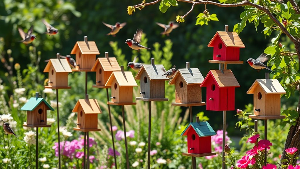 You’ll want bird houses made from durable cedar or quality plywood with weather-resistant finishes that keep swallows safe and dry. Look for designs with 1.5-inch entrances to deter predators like sparrows and squirrels. Features such as metal predator guards, proper ventilation, and easy-to-clean access make maintenance simple.