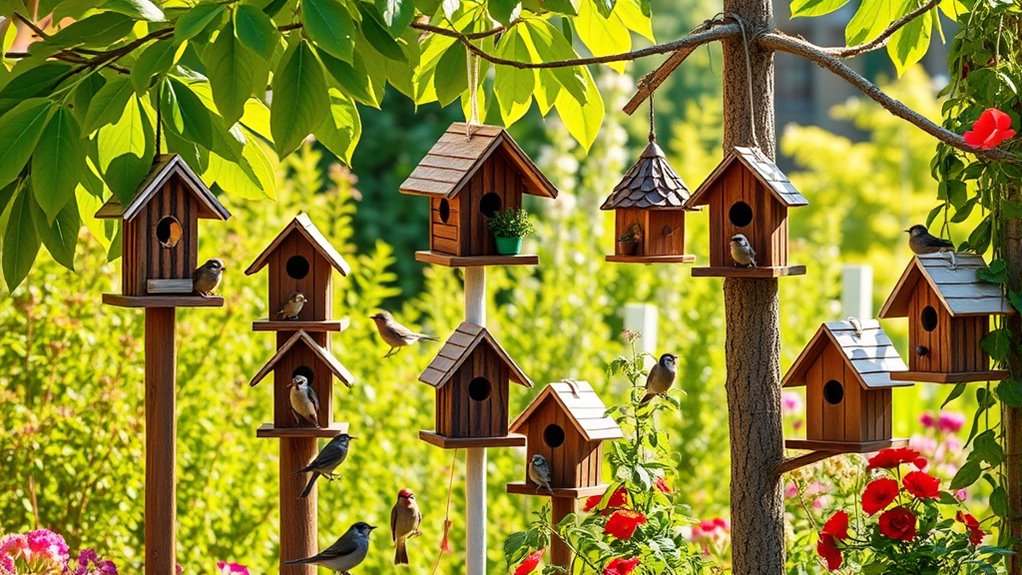 You’ll find that colorful, decorative houses lure finches, and deeper, more spacious boxes invite owls. Match your birdhouse style to local species, and you’ll enjoy vibrant visits right outside your window.