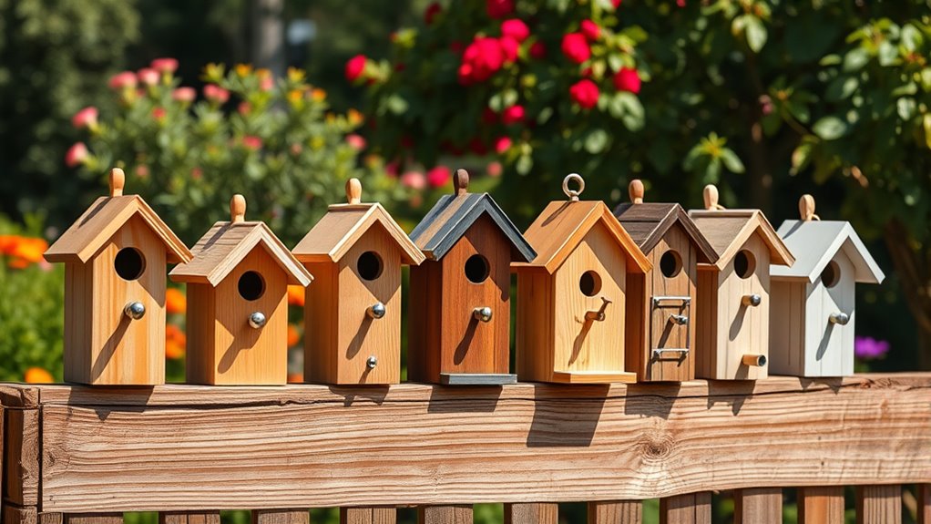 Placement matters too—install your bird house high enough and away from trees or structures squirrels could use as launching points. Some advanced designs even have built-in mechanisms that close or block entry points when a squirrel tries to enter, ensuring your feathered friends stay safe. By focusing on these design elements, you can effectively deter squirrels and provide a secure home for birds without risking intrusion or damage.