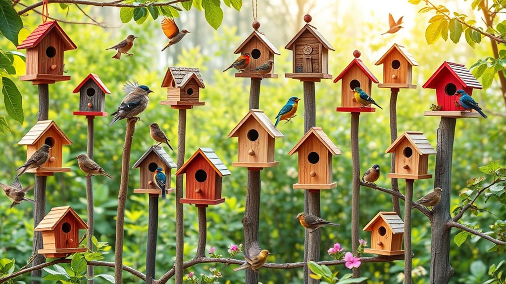 Choose styles that balance function and charm to create a welcoming bird habitat. Keep exploring to find the best fit for your feathered visitors.