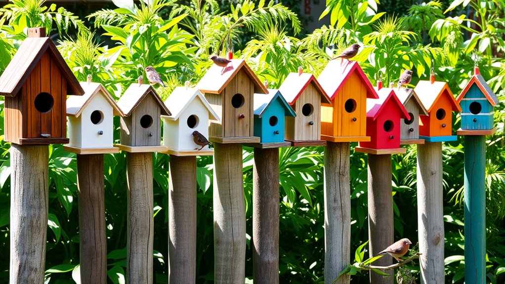You’ll want bird houses made from sturdy, weather-resistant cedar or pine with predator guards like copper surrounds to keep small birds safe. Look for entrance holes sized around 1-1/4 inches to attract wrens, chickadees, or hummingbirds.