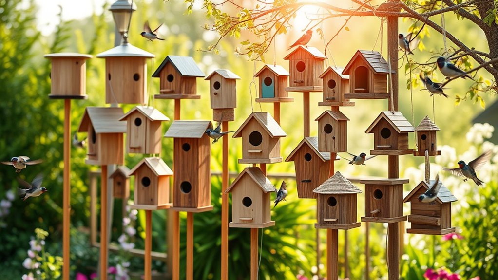 You’ll want bird houses made from durable cedar or HDPE with 1.5-inch entrances to attract swallows while keeping predators out. Look for features like metal predator guards, ventilation, drainage, and interior grooves to help fledglings exit safely.