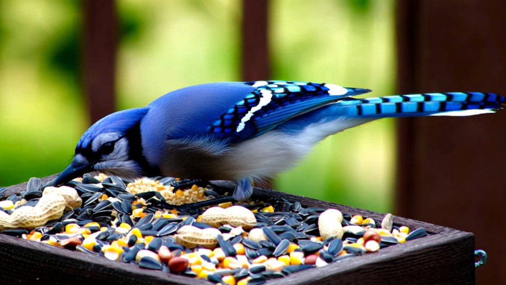 If you want to attract more Blue Jays and other backyard birds, consider offering a mix of seeds, combining sunflower seeds, corn, and peanuts. This variety meets their preferences and nutritional needs, making your feeder a popular spot for these vibrant birds.