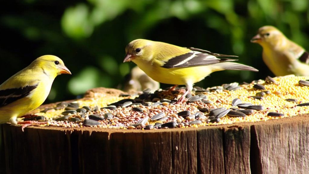 You’ll attract and nourish vibrant goldfinches by using high-quality seeds like Happy Wings Nyjer/Thistle, Pennington Pride Wild Finch Blend, and Kaytee Wild Finch blends, all rich in protein and healthy fats.