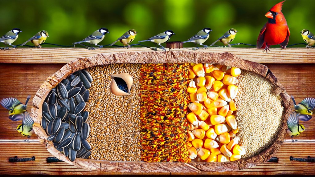 When you pick bird seed, think about the feeder you’ll use, since certain seeds work better with specific feeder types. Tube feeders, for example, are perfect for small seeds like Nyjer or thistle, helping keep bigger birds away.