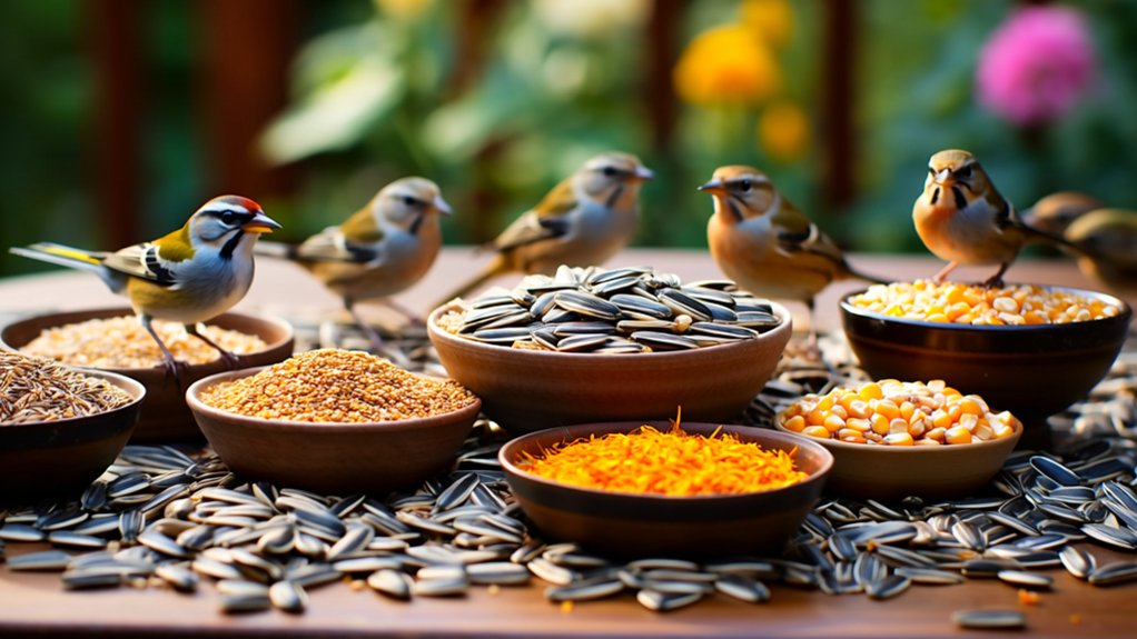 Since nutritional content directly impacts birds’ health and energy, you should prioritize high-quality seeds that meet their dietary needs. Seeds rich in fats and proteins, like sunflower seeds and nuts, provide the energy birds need, especially during breeding and migration.