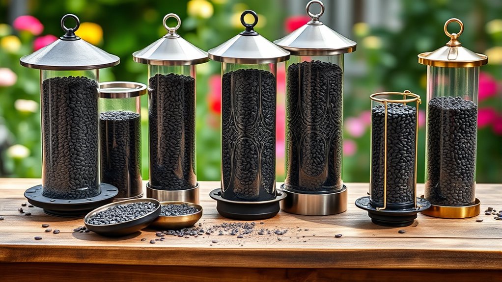 When choosing a black oil sunflower seed bird feeder, you’ll want to evaluate the material’s durability and the feeder’s seed capacity to match your needs. Look for squirrel-proof features to keep your seeds safe and make sure the feeder is easy to refill.