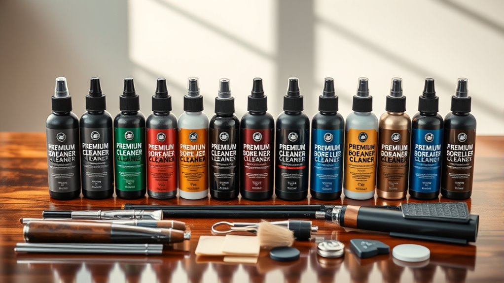 A highly effective cleaner can cut your cleaning time by up to 80%, letting you spend less time scrubbing and more time shooting. Confirm the cleaner you pick works well with your firearm’s materials—some formulas can damage rubber, polymer, or painted finishes. Prioritizing these factors guarantees your bore cleaner not only cleans thoroughly but also preserves your gun’s condition and reliability.