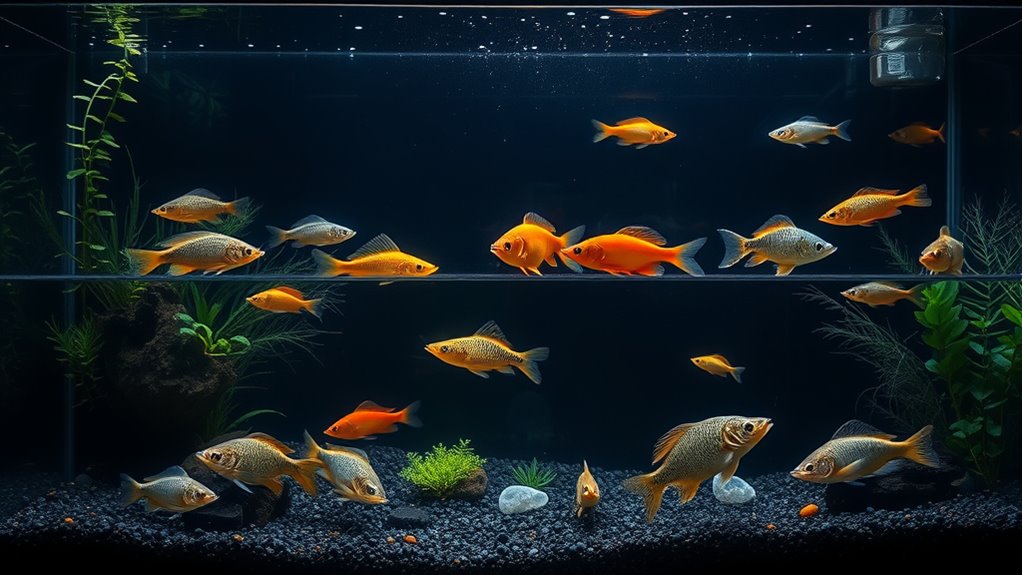 Consider probiotics and waste-reducing foods—they can improve water clarity and overall quality. Track pH, ammonia, nitrite, and nitrate to keep conditions safe for your species. Proactive monitoring helps you spot issues early, preventing crashes and health problems.