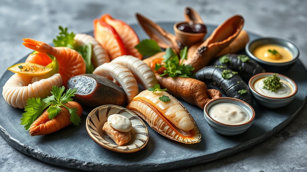 When choosing bottom feeder food, aim for a protein mix that covers all the essentials. A diverse range of protein sources, such as insects, squid, shrimp, and seaweed, guarantees a balanced diet for bottom feeders. Incorporating multiple high-quality proteins can enhance fish growth, coloration, and overall health, giving you more vibrant, robust specimens.