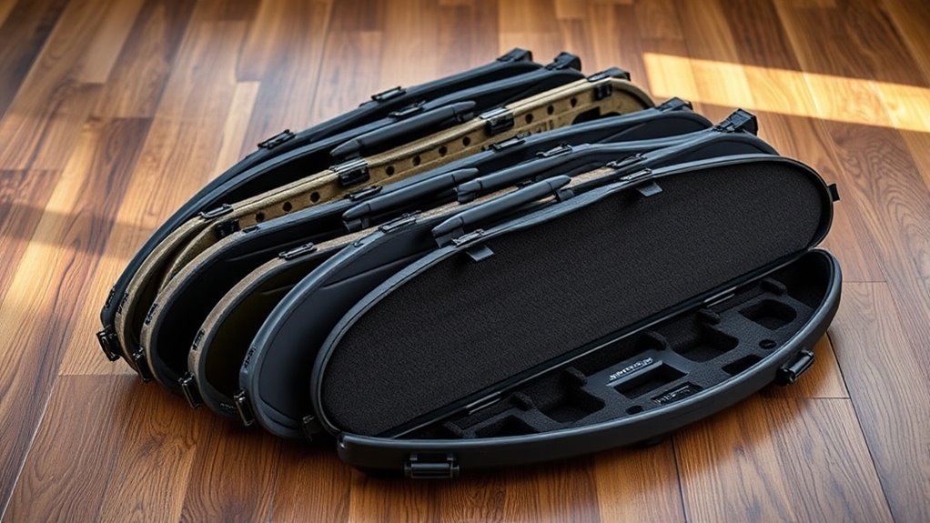 Because your Mathews V3 deserves reliable protection, you’ll want a bow case made from impact-resistant materials that can handle drops and collisions. Look for cases crafted from durable plastics like polypropylene or high-strength polymers, which offer excellent dustproof qualities and strong structural integrity.
