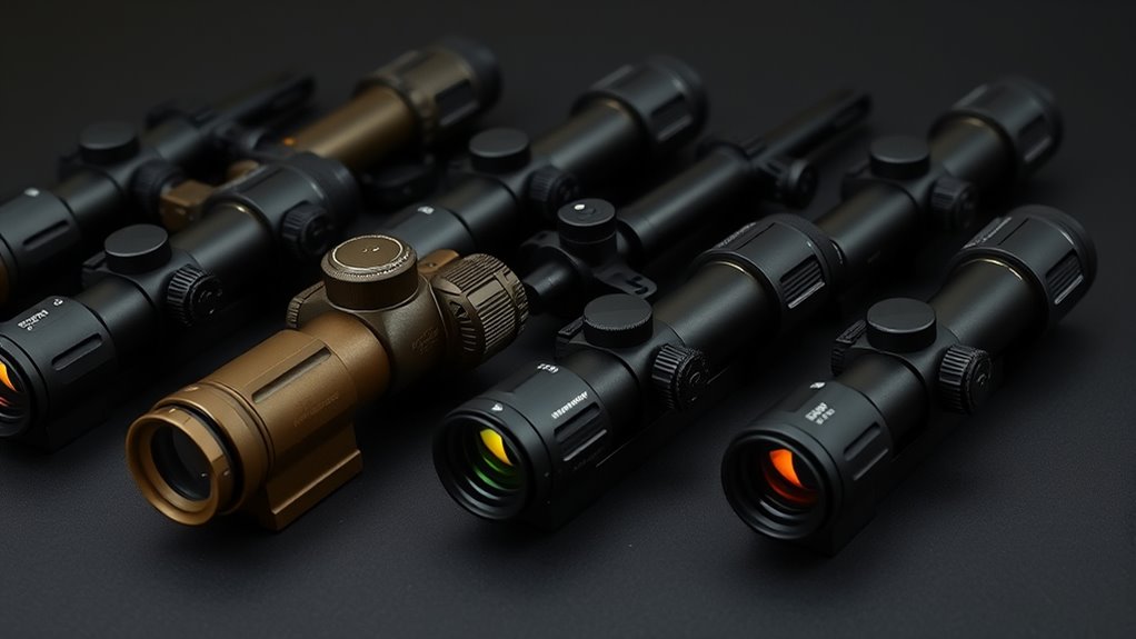 You’ll get clear optics with adjustable brightness and solid performance for tactical or hunting use—all without breaking the bank. Keep exploring, and you’ll discover even more features that make these optics stand out.