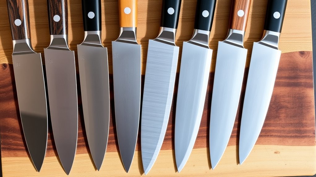 The hardness, measured on the Rockwell scale, determines how well a blade holds its edge versus how tough it is—higher hardness means sharper but potentially more brittle. You’ll also find options like stainless steel, D2 steel, or ceramic, which provide superior resistance and durability but might come at a slightly higher cost.
