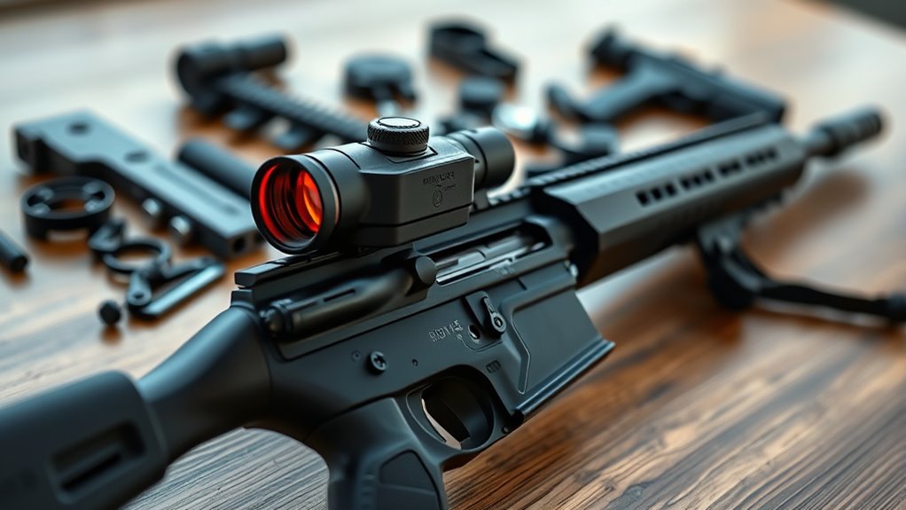 Choosing the right mounting compatibility is essential to guarantee your budget rifle red dot sight fits securely and functions properly on your firearm. First, make sure the sight matches your firearm’s mounting system, whether it’s Picatinny or Weaver rails. Check if the sight includes adaptable mounts or riser options, which help with co-witnessing iron sights or adjusting for specific height needs.