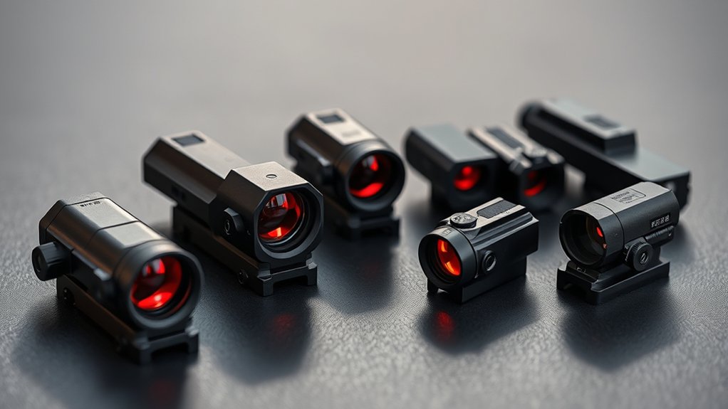 Sealed electronics and gaskets prevent water ingress, protecting internal components. Reliable sights undergo standardized immersion and recoil testing, so check for these validations. Prioritizing waterproof and shock-resistant features guarantees your red dot stays functional and accurate, even in harsh environments.
